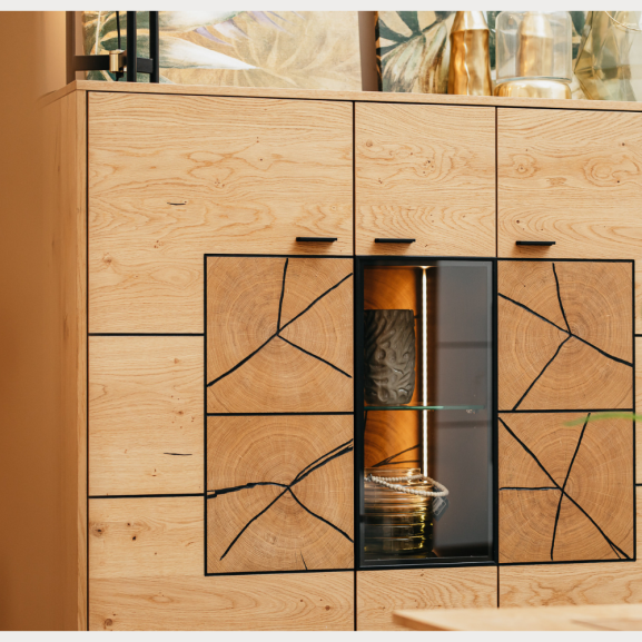 Colectia Urbano Oak aduce eleganță și rafinament în decorul casei tale, punând în valoare frumusețea naturala a lemnului într-o nuanță caldă de stejar rustic și negru contemporan. Sistemul cu închidere silentioasă reprezintă un aspect funcțional esențial, oferind o experiență de utilizare lină și lipsită de zgomot. Sistemul de iluminare cu LED este integrat cu atenție pentru a evidenția frumusețea detaliilor și a adăuga o ambianță plăcută în încăpere. Urbano Oak este alegerea ideală pentru cei care apreciază calitatea premium și caută un design modern și sofisticat.