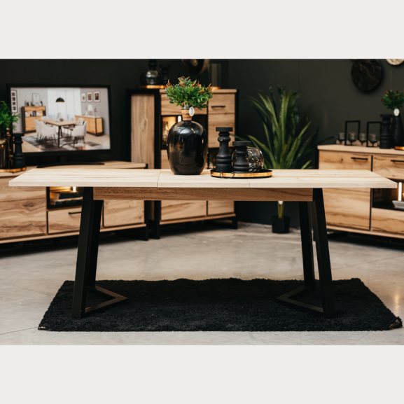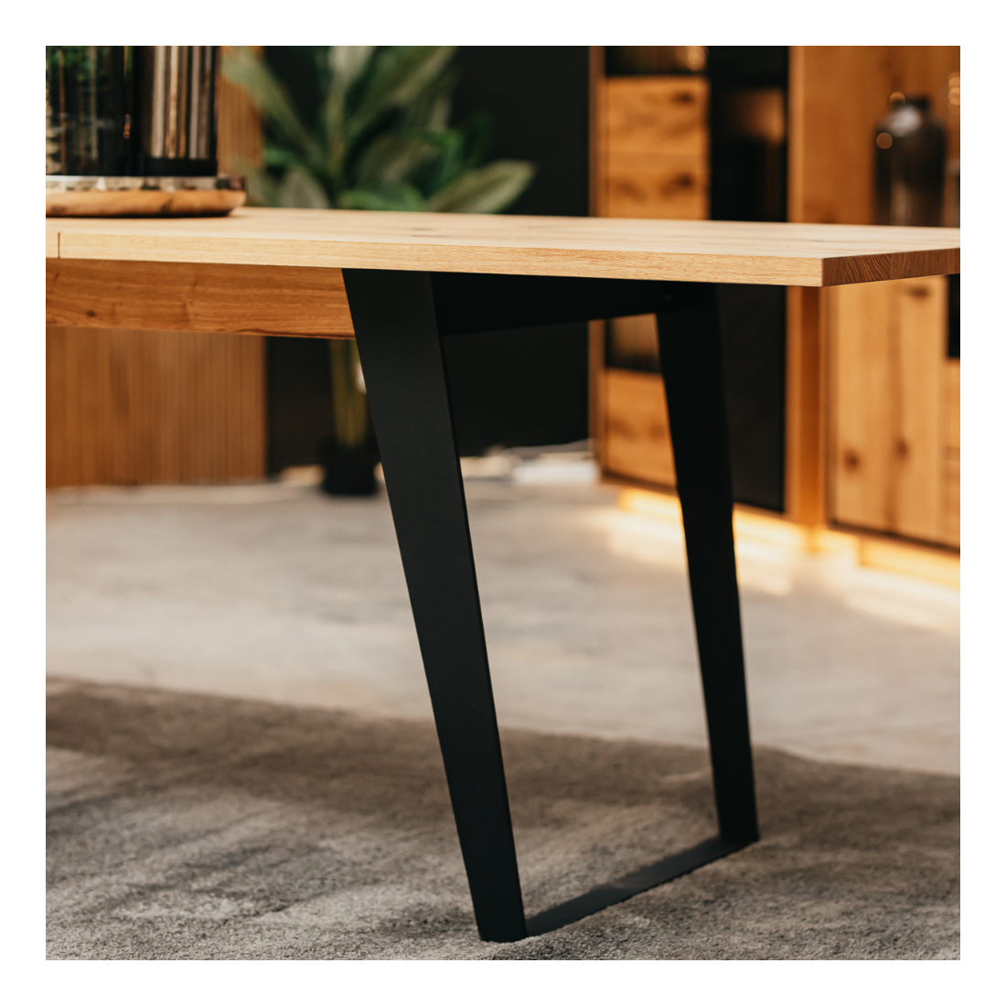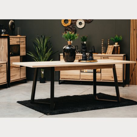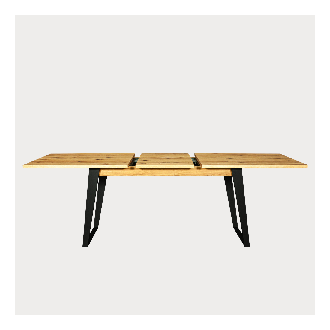 Realizată cu atenție la detalii din furnir de stejar în culori natur și negru, această masă emană un farmec autentic și durabil.